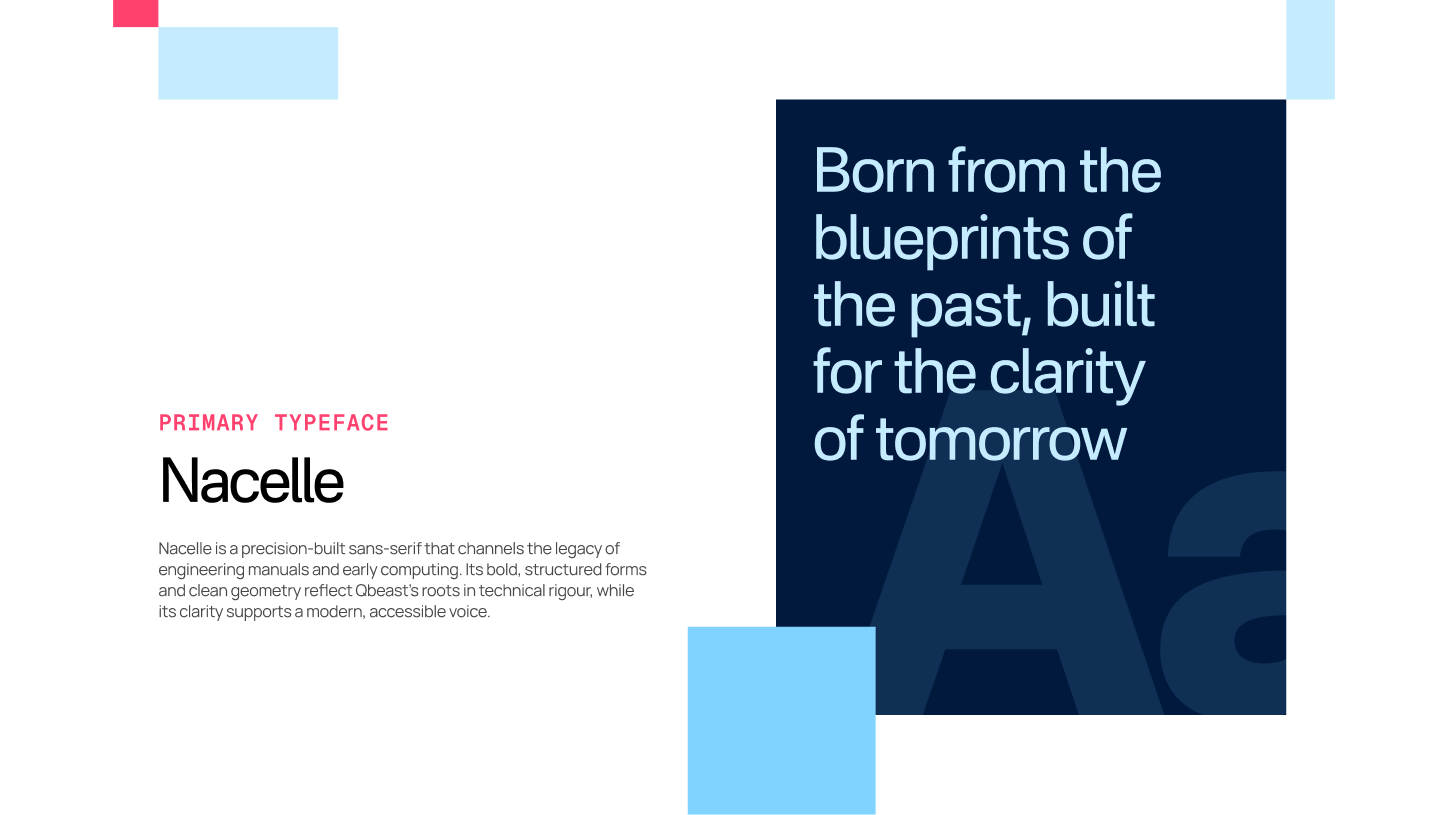 Typography reinforces this structure. Nacelle brings confidence and modern clarity to headlines, Manrope ensures warmth and readability in body copy, and Geist Mono provides precision in technical contexts. Together, these elements create a visual language that is intentional, scalable, and aligned with Qbeast’s promise of speed, structure, and clarity in complex data environments.