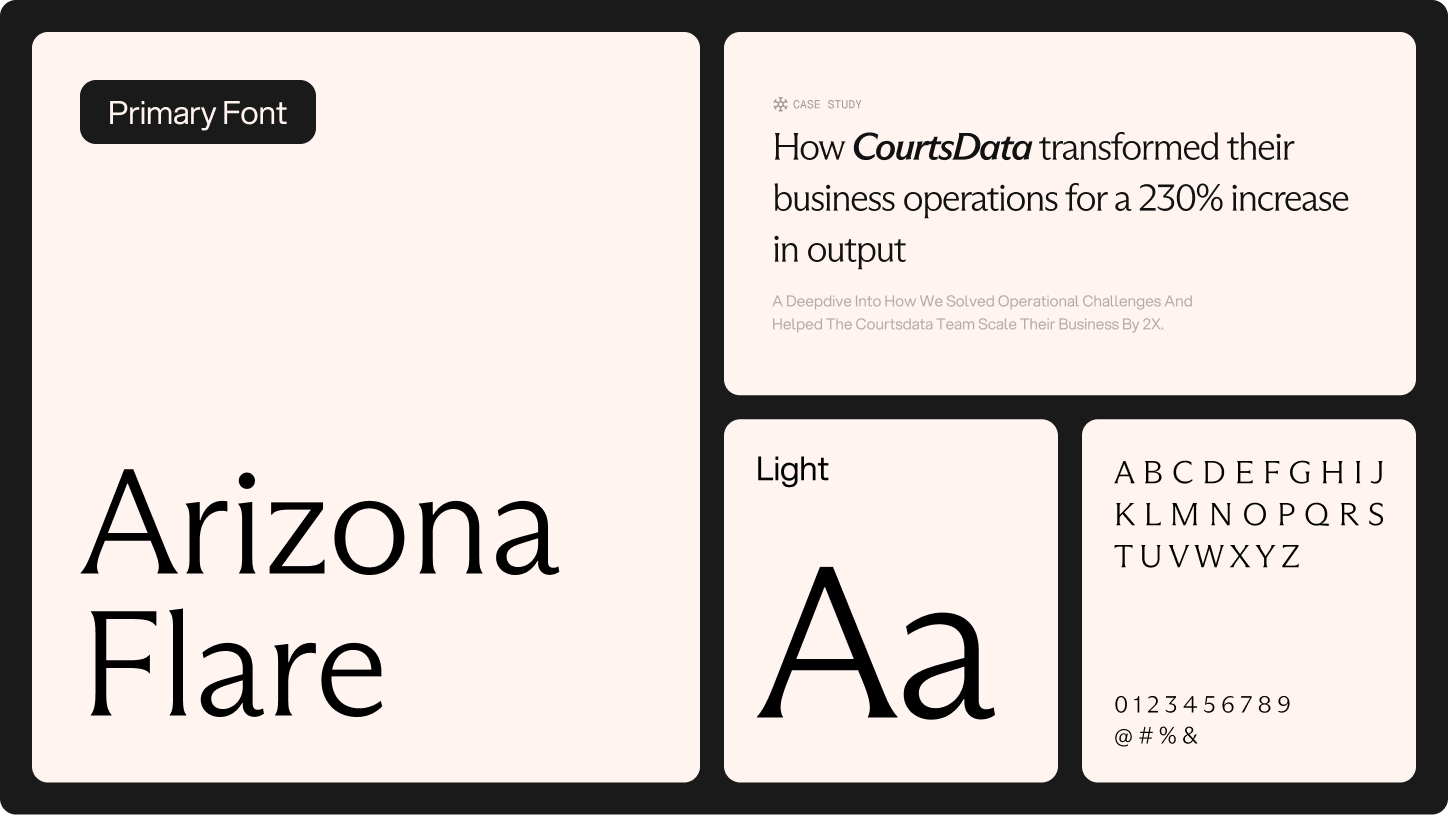 Building on the gradient foundation, we developed a cohesive system of typography, colour, and graphic elements. Arizona Flare introduces authority and refinement, balanced by the clarity of Aspekta and the precision of Geist Mono for technical touchpoints.